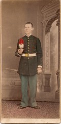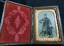 Union Soldier Musician - Union Musician Soldier tintype housed in a scarce 1/8 leatherette case, repaired spine. The size is 3 3/4" by 2 1/2". Check out the circa 1845 militia officer belt buckle. Nice Image Here. - Price is $ 850.00 plus shipping and insurance. Item - I-24