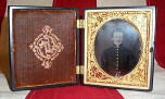Union Soldier Tintype - This is a sixth plate tin type in a thermoplastic case, size is 2 3/4" x 3 1/4". The soldier is wearing a 9 button frock coat. The picture is very clear. The case is excellent, with pears in the center. Union Case is made by the "Littlefield, Parson & Co", case has the patent date of "October 14, 1856 and April 21, 1857". - Price is $ 250.00 plus shipping and insurance. Item - I-15
