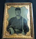 Union Soldier - Large scarce 1/2 plate tintype, 1/2 case, size is 4 1/4" by 5 1/2". Not sure if he holding a saber bayonet or a short sword, sack coat buttons look to be cloth covered, check out the pattern 1855 riflemans belt buckle. - Price is $ 800.00 plus shipping and insurance. Item - I-18