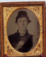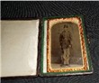 Union Soldier Image - Union soldier wearing shoulder belt, waist belt with U. S. buckle, with view of cap and cartridge box. Image is a 1/9 plate tin-type, size 2 1/2" X 2". Case has normal wear, with a good clear image of soldier. - Price is $ 200.00 plus shipping and insurance. Item - I-5